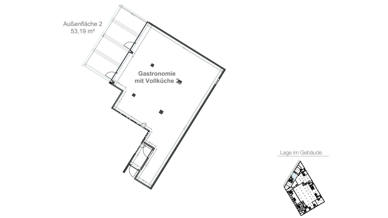 Mietfläche: 239,96 m² Restaurantfläche, 53,19 m² Terrasse, 40,47 m² Lager im UG